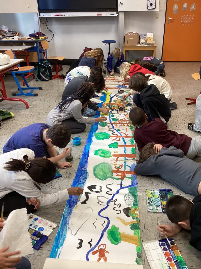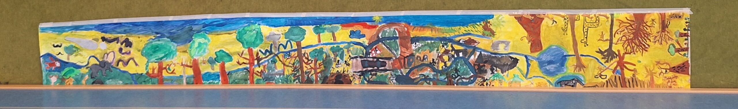 Es ist außerdem ein großes Afrika-Bild auf Tapete entstanden, an dem wir als ganze Klasse gemeinsam gemalt haben.