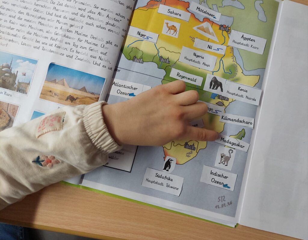 Auch inhaltlich beschäftigten wir uns intensiv mit dem Kontinent Afrika. Gemeinsam entdeckten wir, wo Afrika auf der Weltkarte liegt, und erforschten die Vielfalt des Kontinents. Wir lernten unterschiedliche Landschaften kennen, informierten uns über beeindruckende Sehenwürdigkeiten und beschäftigten uns mit der faszinierenden Tierwelt.