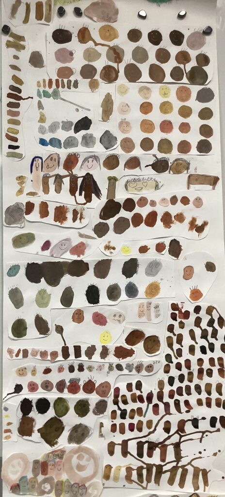 Wir haben überlegt, wie viele verschiedene Hautfarben es eigentlich gibt und sind zu dem Ergebnis gekommen, dass es eigentlich unendlich viele gibt, weil es ja ganz viele Abstufungen gibt. Also haben wir versucht, viele verschiedene Hautfarben mit Deckfarben zu mischen. Es war gar nicht so leicht, dann auch unsere eigene Hautfarbe zu mischen. Am Ende haben wir Gesichter in die Farben gezeichnet und eine große Collage gemacht.