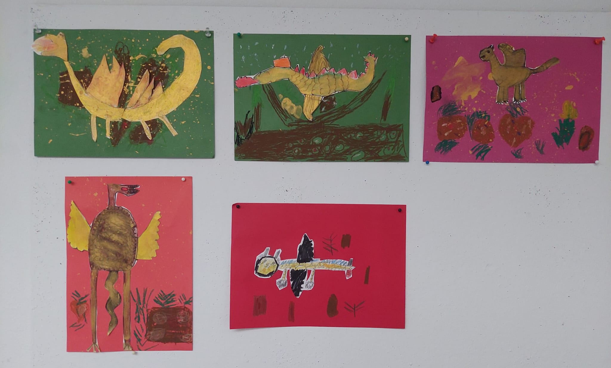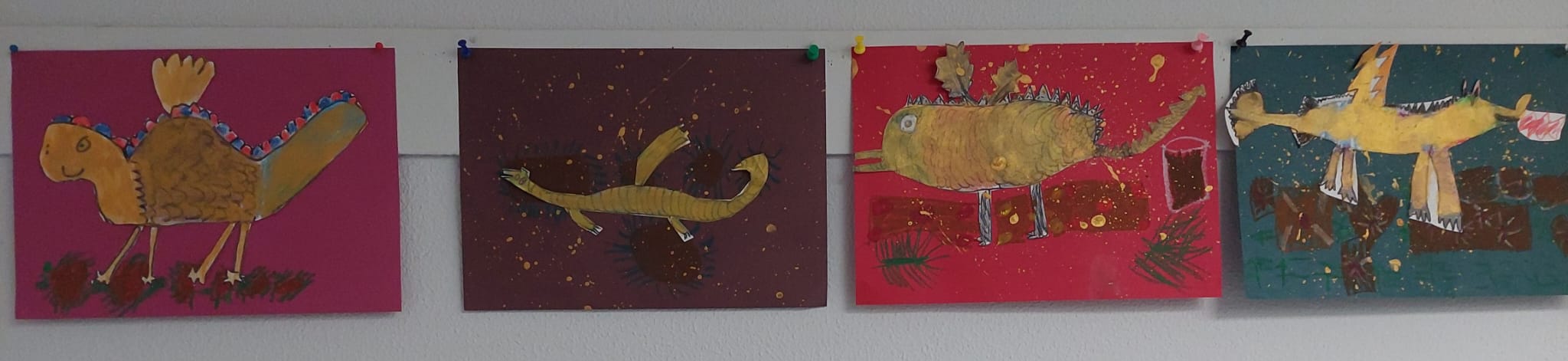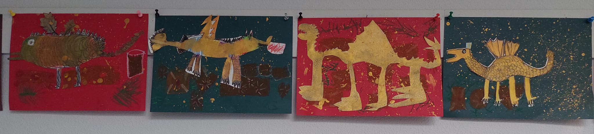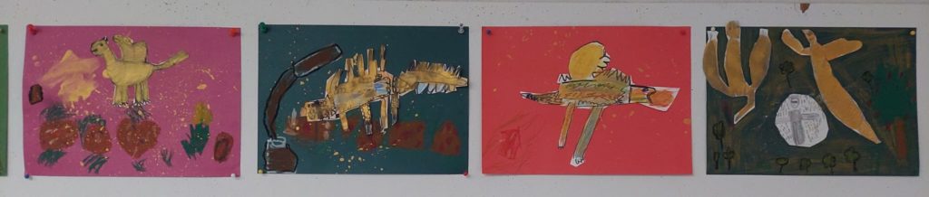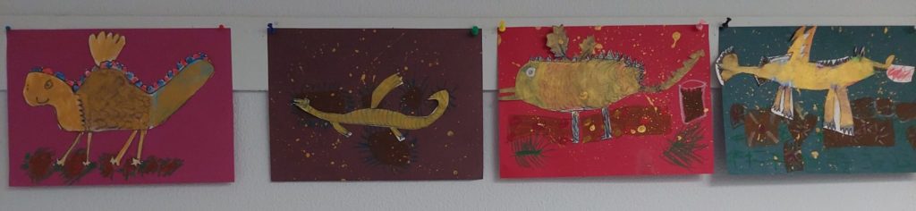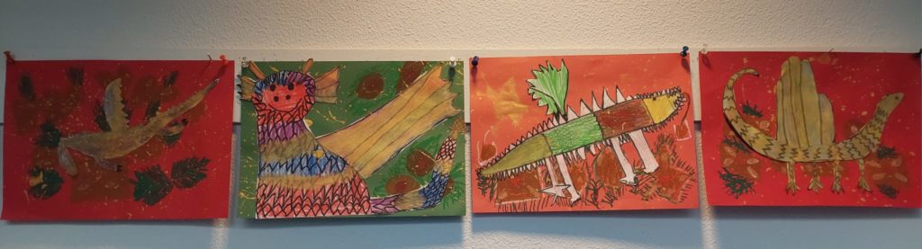 In der Eulenklasse wurde das Buch „Spekulatius, der Weihnachtsdrache“ gelesen und die Kinder haben sich zusammen verschiedene Drachendarstellungen angeschaut. Anschließend haben sie eigene Weihnachtsdrachen gemalt: